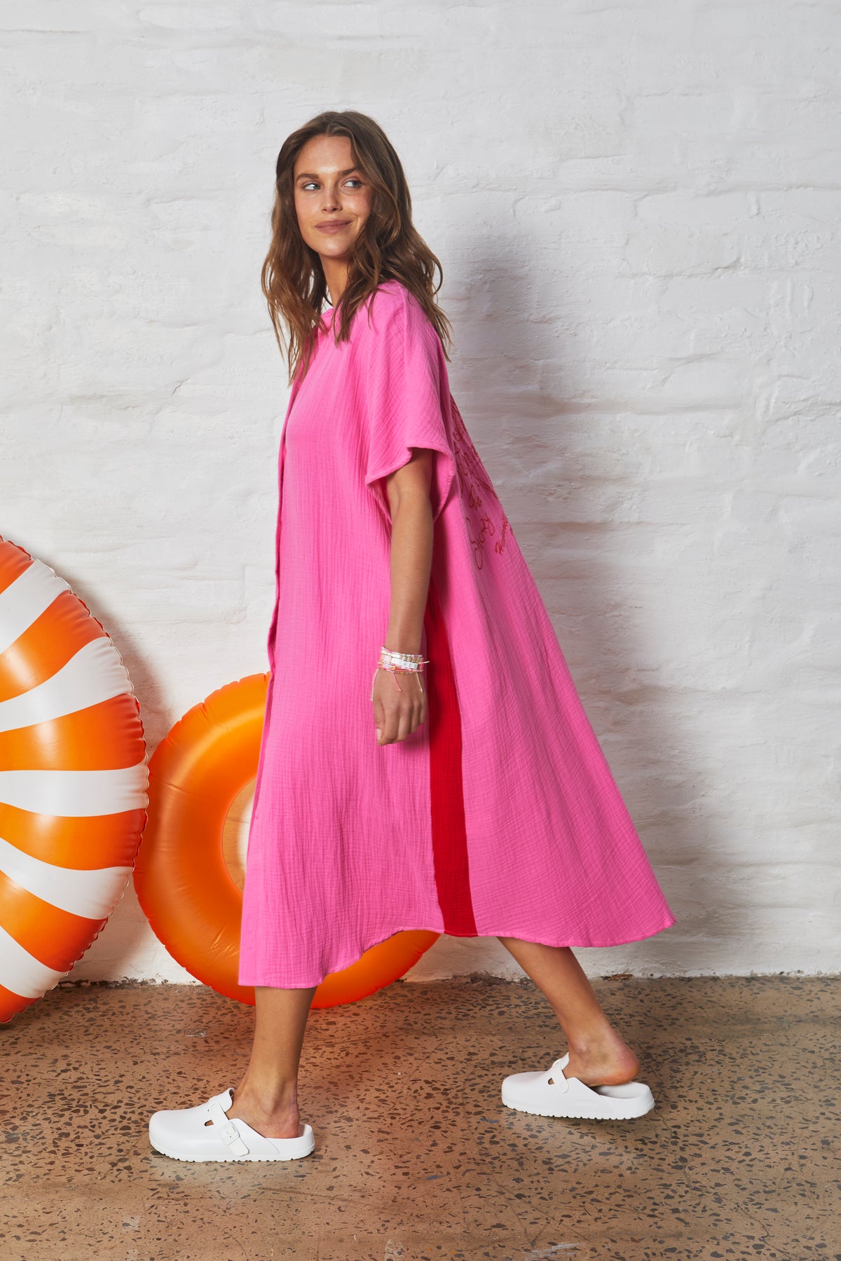 3/4 length slouchy, comfy style beach dress with wide comfy sleeve openings and full button front. Great over bathers or back with some sneakers.
