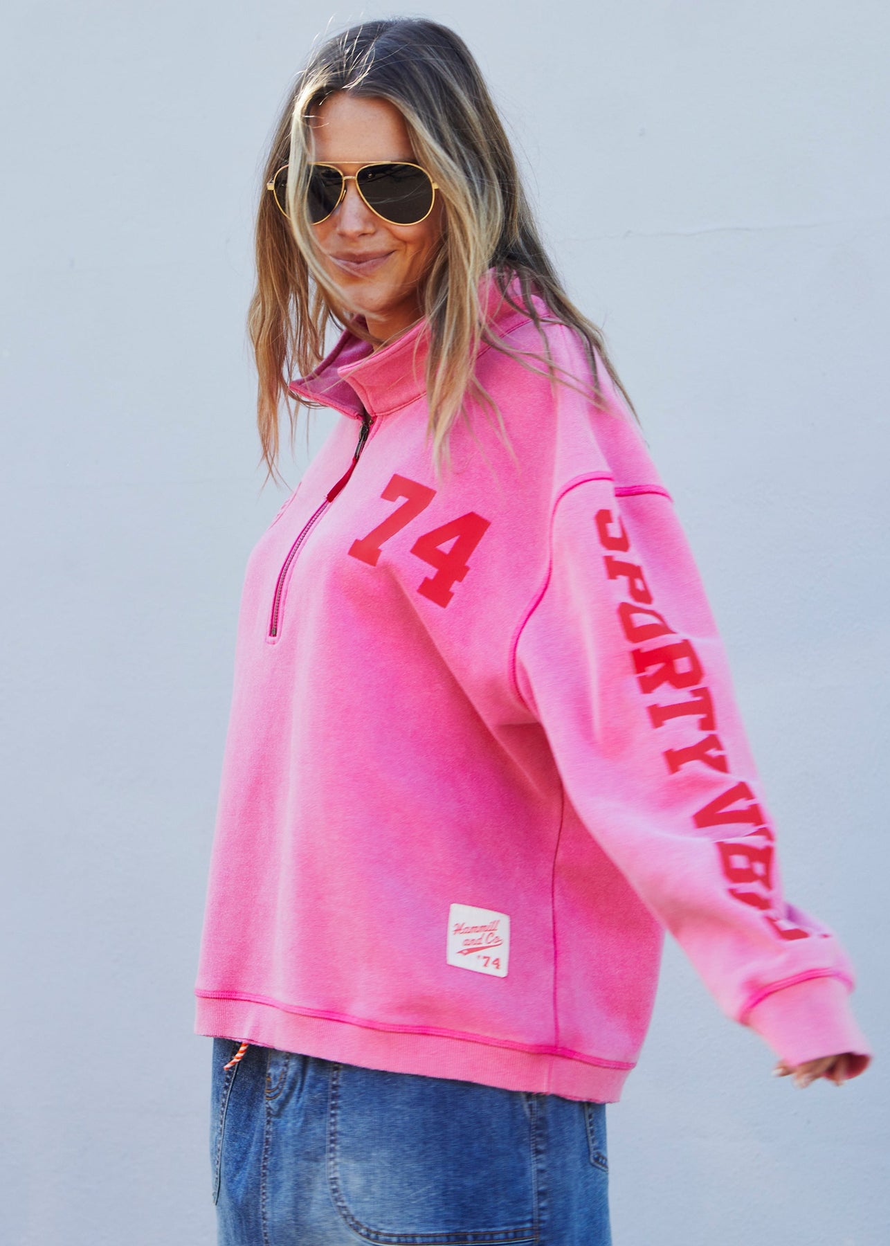Vintage wash is the feature of this sweat, soft, sun-fade tones in soft pink with highlight red print colours. Our newest best selling 1/2 zip style, which is slouchy, wider, relaxed sleeves and relaxed waistband. Looks great worn back with denim!