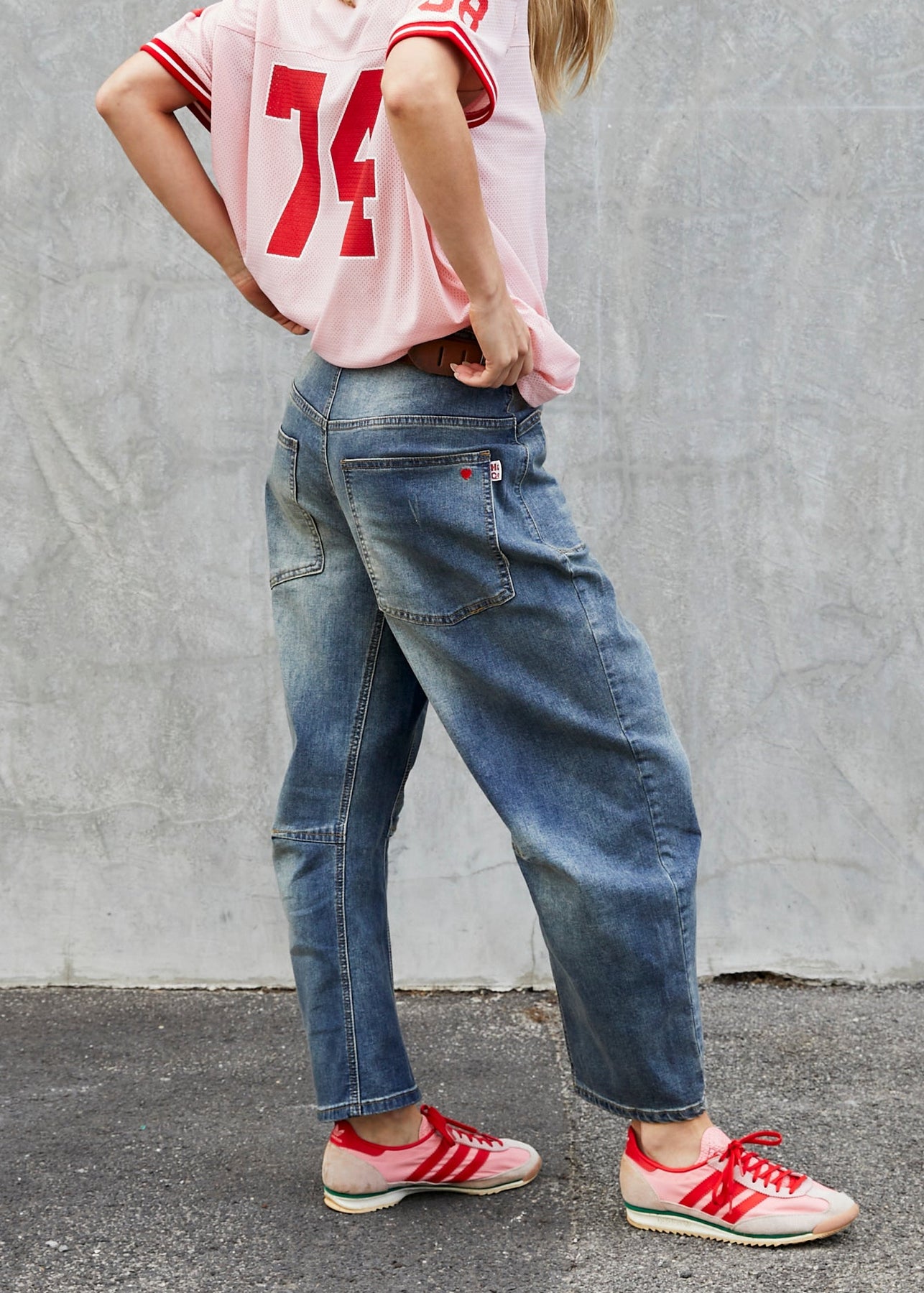 Our best selling Carpenter jean fit now comes in a super comfy stretchy denim with our new signature red heart embroidery on the back pocket. Repeat order coming.  Register your interest against your sold out size.