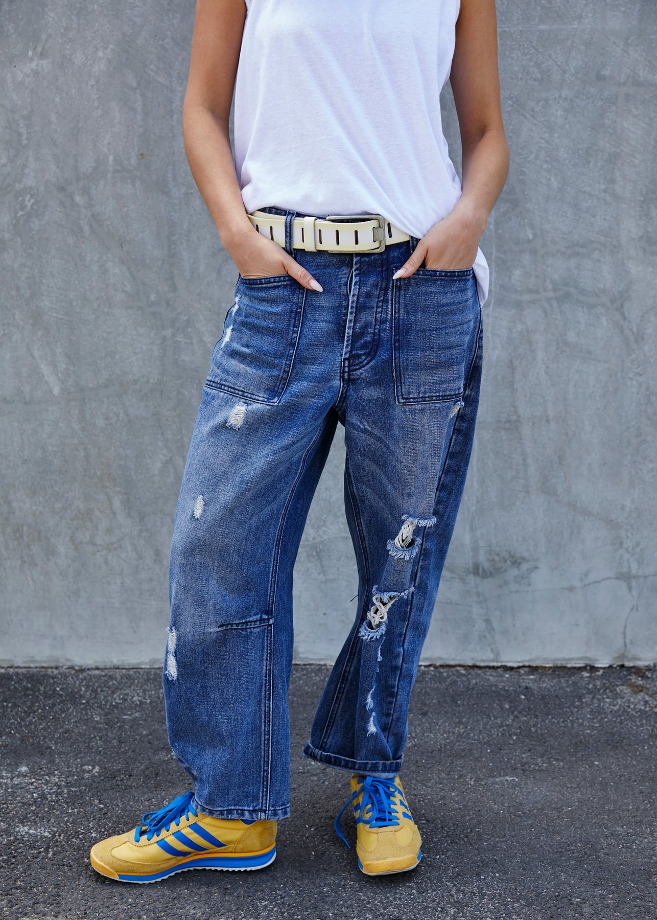 - Slouchy utility pockets on the front and back