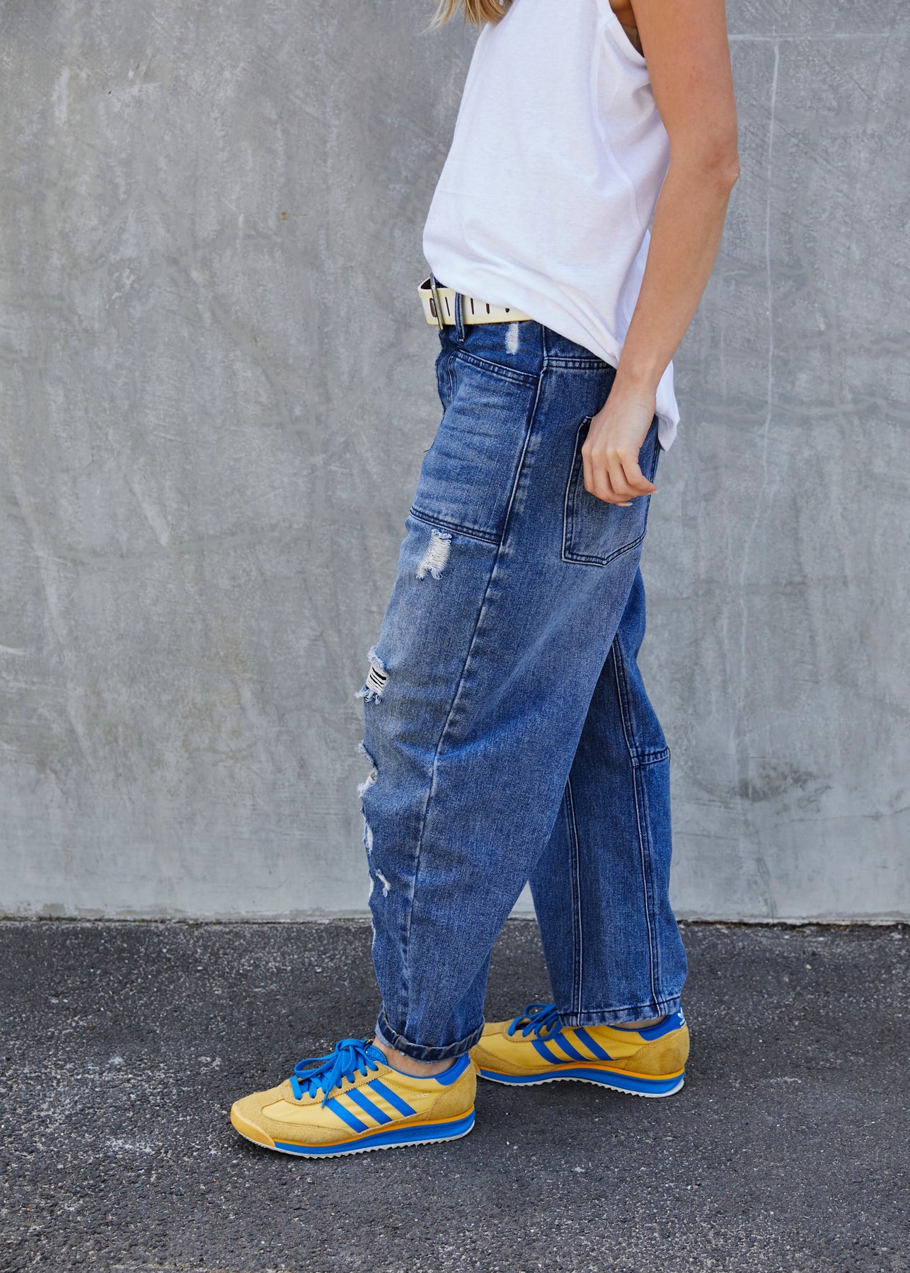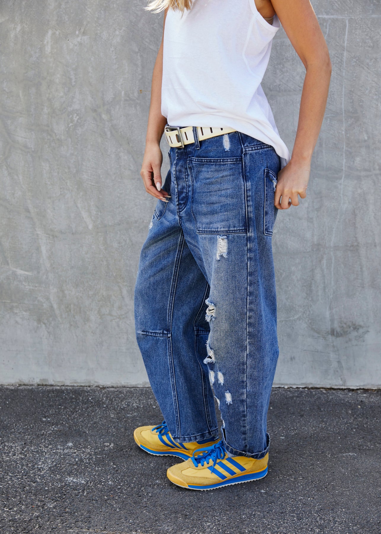 - Our model is wearing the medium to create an oversized slouchy look, she is a size 10 and they are sitting on her hips.