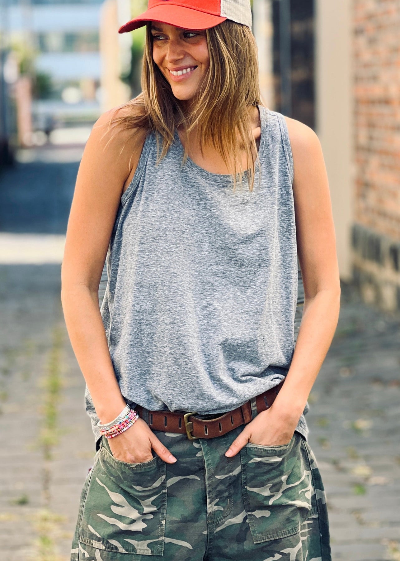 New Grey marle layering tank in soft cotton is back in stock, longer length with scoop front and back hem, wider in the body, wide sleeve opening and lovely non-sheer cotton. Great under all our coloured sweats.