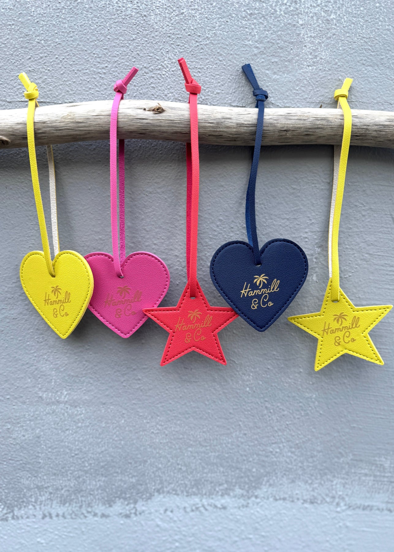 Features a soft, heart-shaped yellow bag tag embossed with  a gold Hammill & Co logo.