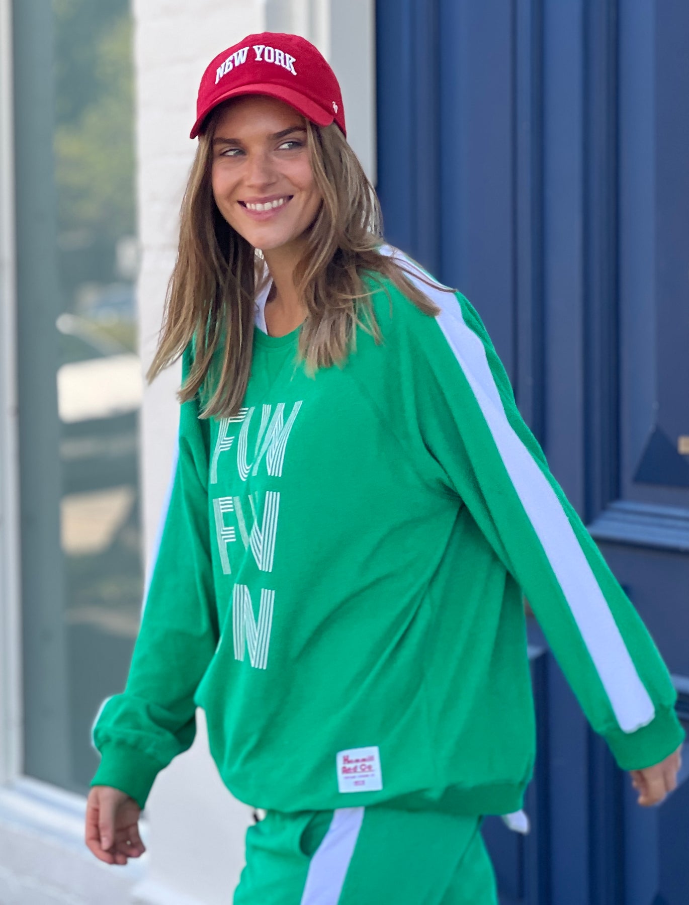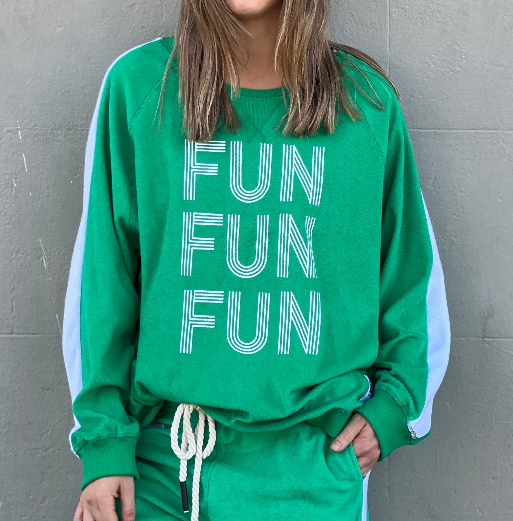 Hammill & Co lightweight, soft towelling sweat in green/white. Features our new Fun, Fun, Fun  print on the front, white panelled stripes down each sleeve, longer body length and rib waistband.